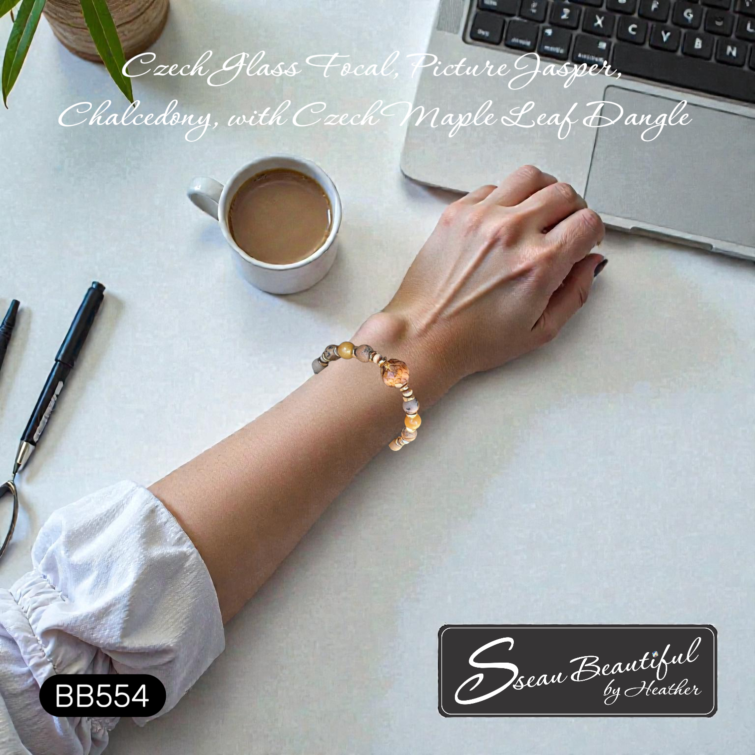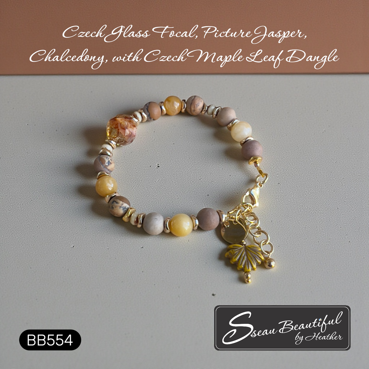 Wear this lovely, one-of-a-kind, adjustable bracelet from the office to shopping to social gatherings. Featuring an absolutely gorgeous 12mm Czech Glass Fire Polish focal combined with a variety of warm coloured Picture Jasper, Chalcedony, Hematite, Czech spacers, and completed with a Czech Glass Maple Leaf charm.