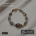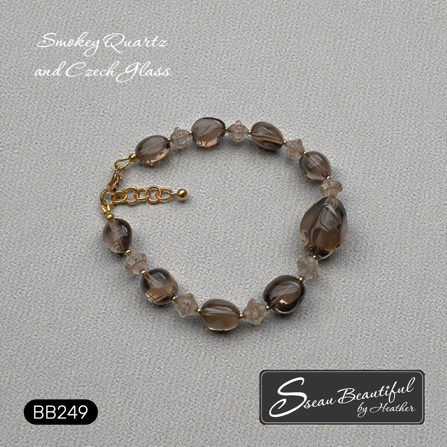 This sophisticated bracelet showcases a striking 15mm Smokey Quartz focal stone paired with complementary Smokey Quartz nuggets that catches light beautifully, interspaced with Czech glass Saturn spinners for depth and visual interest. Finished with 18k gold-plated spacers and a secure gold-tone stainless steel lobster clasp, this piece combines quality craftsmanship with elegant design. Fits wrist size 7.5 - 8.0 inches, making it a versatile addition to your jewelry collection.