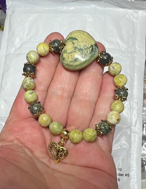 Serpentine Heart Focal 25x28mm, Matte Green Serpentine 8mm, Yellow Kiwi Jasper 8mm, Antique Gold alloy Bead Caps, Stainless Steel Bail, with a Filigree Antique Gold alloy Heart Charm $43